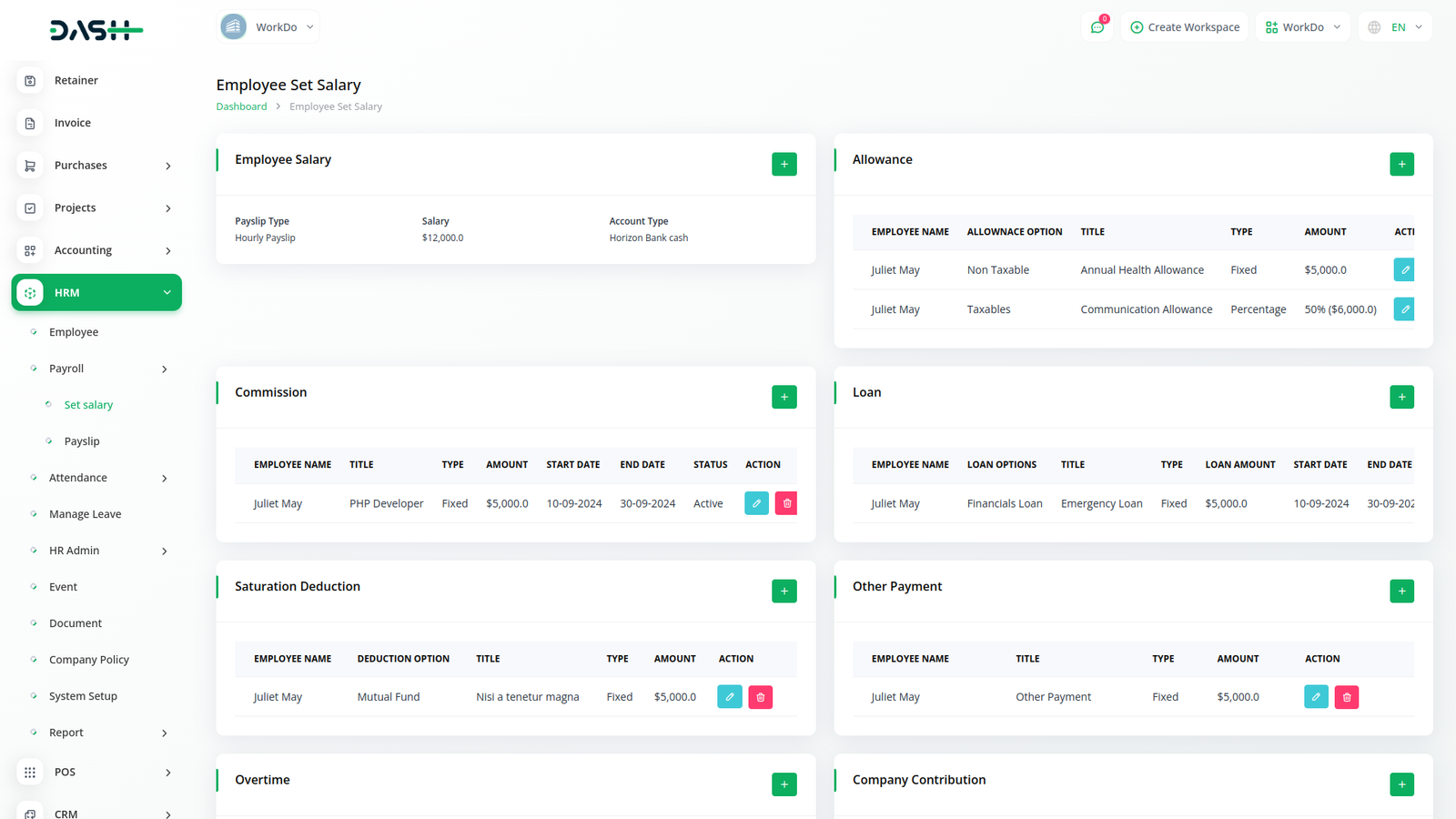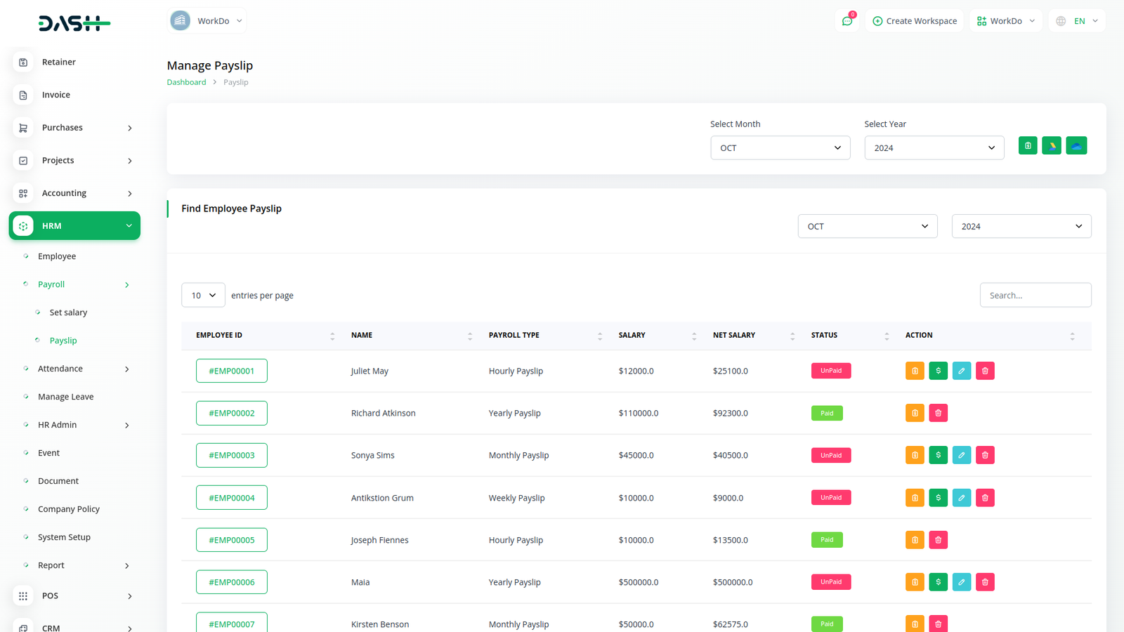 Anda boleh menjana slip gaji bulanan dan membuat pembayaran pukal melalui klik mudah. Anda juga boleh menukar status slip gaji dengan CTA yang mudah. Seorang pekerja boleh melihat pecahan komponen gaji mereka.