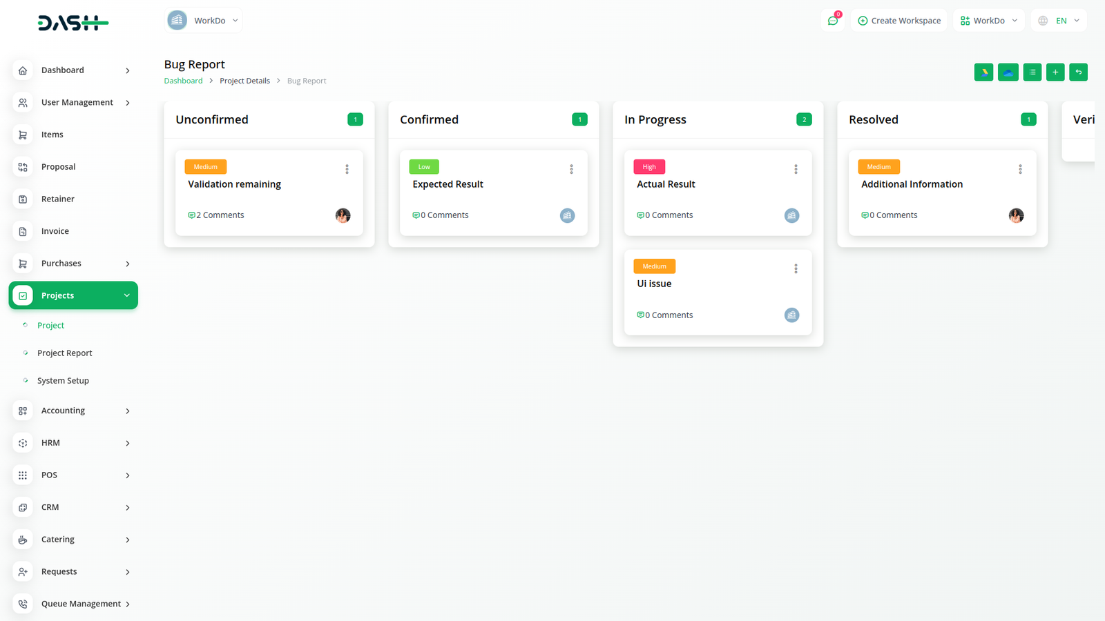 Create new bugs and assign users and priority to them. You can write a note in the text box for the bug description. Also, the status of each bug could be changed through an easy drop-down and Kanban drag system.